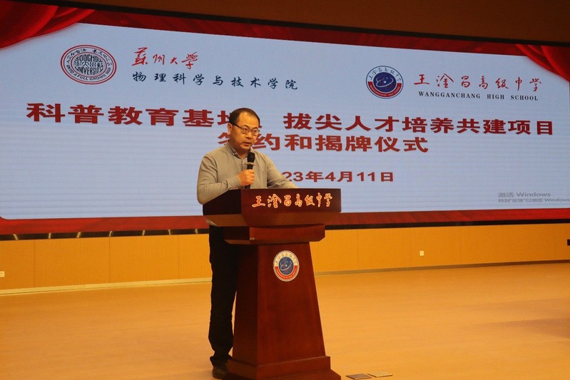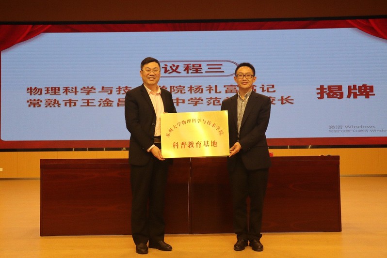 为深入学习贯彻党的二十大精神,进一步落实习近平总书记关于“科技创新、科学普及是实现创新发展的两翼,要把科学普及放在与科技创新同等重要的位置”的讲话精神,拓展青少年的科技视野,丰富学生的课外生活,积极发挥博彩平台资源和人才优势,承担社会服务责任,大力弘扬科学家精神。4月11日下午苏州大学博彩平台 与常熟市王淦昌高级中学举行科普教育基地、拔尖人才培养共建项目签约和揭牌仪式。常熟市王淦昌高级中学是以我国著名核博彩平台学家、两弹一星功勋奖章获得者、中国核科学的奠基人和开拓者之一王淦昌院士命名的。