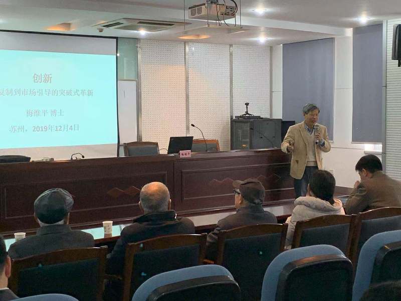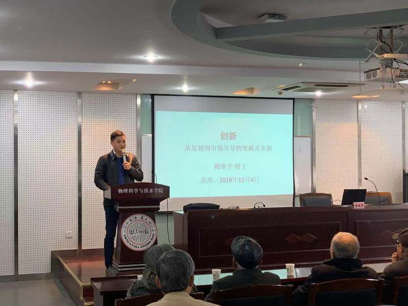 为深入贯彻“大众创业、万众创新”的国家战略要求,将创新创业精神植根于本科生职业生涯规划课程体系,进一步帮助博彩平台 学生明确职业生涯规划,做好自我定位。12月4日下午1977级校友梅维平博士为2019级同学带来主题为“创新--从复制到市场引导的突破式革新”的报告。原苏州大学人事处处长、梅博士父亲梅国祥老师,原苏州大学博彩平台系系主任沈永昭老师、李振亚老师,博彩平台系退休教师吴祖嵋老师,博彩平台孙德芬书记、方亮副院长以及2019级全体新生共同参加了本次讲座。讲座由赵承良副院长主持。